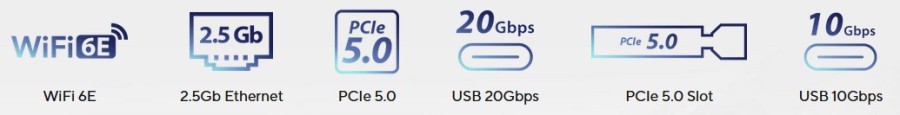 4x DDR5 DIMM, dual PC5-49600U/DDR5-6200 (OC), max. 128GB (UDIMM), Erweiterungsslots 1x PCIe 4.0 x16, 2x PCIe 3.0 x1, 2x M.2/M-Key (PCIe 4.0 x4, 2280/2260/2242), 1x M.2/E-Key (Intel CNVi,